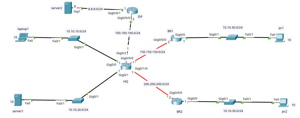 در ادامهی سناریوی قبل میخواهیم ارتباط با دنیای بیرون را برقرار کنیم یک روتر به سناریو اضافه میکنیم به نام ISP و آیپی 100.100.100.2/24 را روی آن ست میکنیم و به سمتی که به HQ وصل شده آیپی 100.100.100.1 میدهیم. به سمت دیگر روتر ISP یک سرور به نام server2 قرار میدهیم. برای این سرور آیپی 8.8.8.8/24 را تنظیم میکنیم. و در سمت دیگر آن در روتر ISP آیپی 8.8.8.1/24 را به اینترفیس مربوطه تخصیص میدهیم. برای ادامهی سناریو چون در محیط شبیهساز هستیم لازم است مسیر برگشت را در روتر ISP تنظیم کنیم: