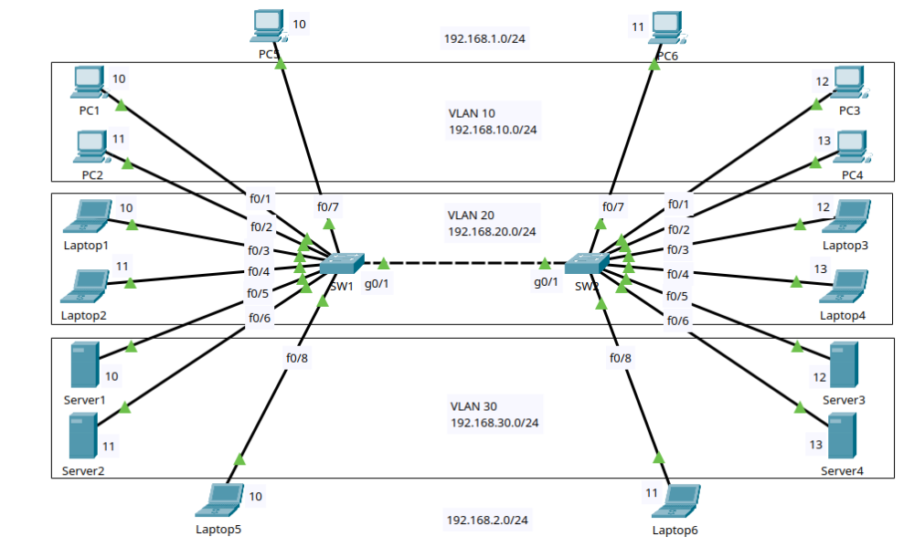 در این سناریو قصد داریم ارتباط بین دستگاههای یک vlan را که به دو سوئیچ مجزا متصل هستند، برقرار کنیم مثلا همهی سرورها با هم یا همهی pcها با هم، فارغ از اینکه به کدام سوئیچ متصل هستند.